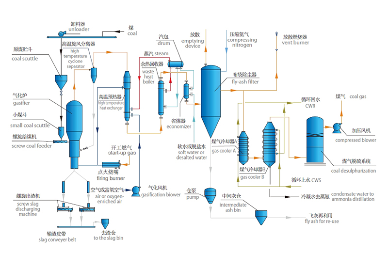 原煤經過破碎后通過皮帶輸送至原煤貯斗,由螺旋給煤機送入氣化爐,與來自高溫預熱器的高溫空氣(或富氧氣化劑)、蒸汽發生氣化反應,所產生的爐渣通過皮帶輸送至渣倉;氣化所產生的粗煤氣夾帶飛灰進入高溫旋風分離器,大顆粒飛灰被分離后返回爐膛繼續反應,小顆粒飛灰與煤氣在高溫預熱器內與來自氣化風機的空氣(或富氧氣化劑)、汽包的蒸汽進行熱交換,產生高溫氣化劑;出高溫預熱器的煤氣再進入余熱回收器、省煤器與水進行熱交換,產生飽和蒸汽;出省煤器的煤氣進入布袋除塵器,在此小顆粒飛灰被過濾并送入氣力輸送系統,所產生的潔凈煤氣進入煤氣冷卻器,降溫后進入煤氣脫硫系統脫除硫化氫,經煤氣加壓系統加壓后送入用戶(煤氣脫硫及煤氣加壓系統可根據后續工藝選擇性建設)。